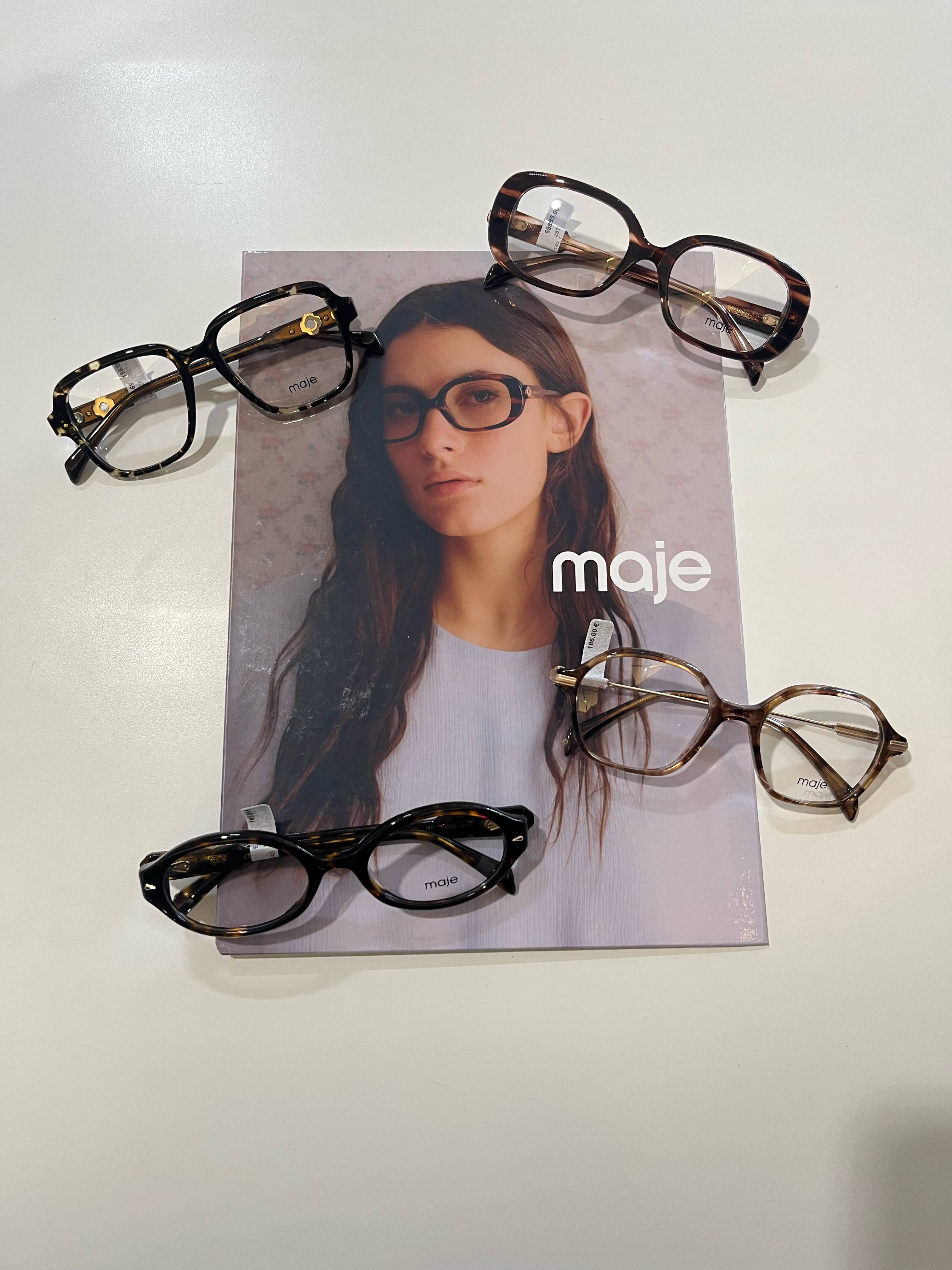 En lunettes de vue ou des solaires, Maje mise sur des matériaux de qualité, des formes actuelles et des finitions raffinées : acétats colorés, touches métalliques dorées, jeux de textures.